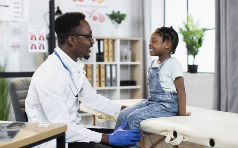 A team of doctors collaborates during a pediatric examination, ensuring the child receives careful and professional medical attention.
